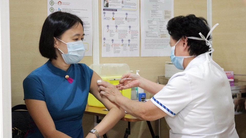 A nurse administers a COVID-19 vaccine to a woman at Singapore General Hospital