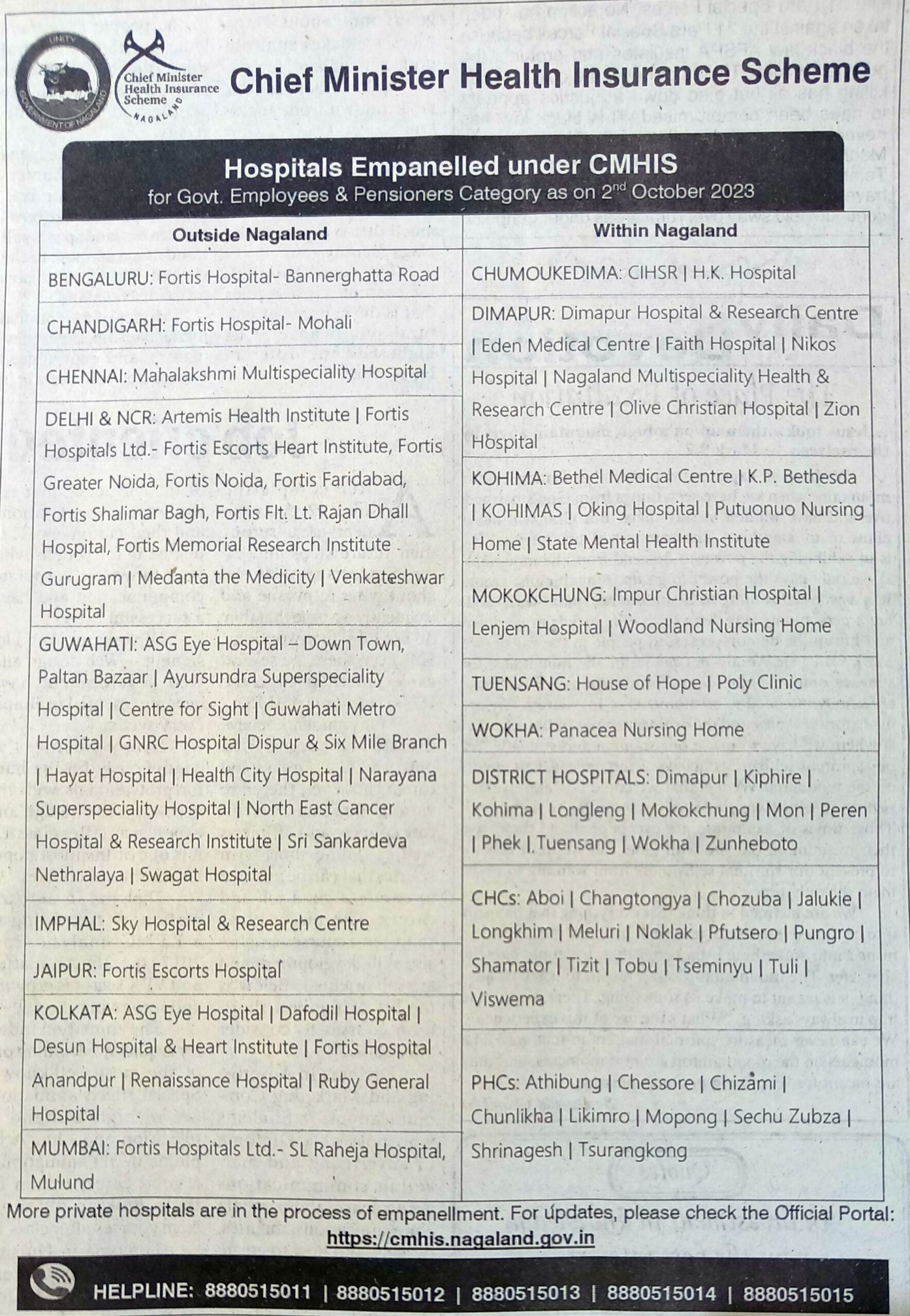 Hospitals throughout the country have been empanelled under the Nagaland Chief Minister’s Health Insurance Scheme – CMHIS for Government employees and pensioners category as on 2nd Oct. 2023.