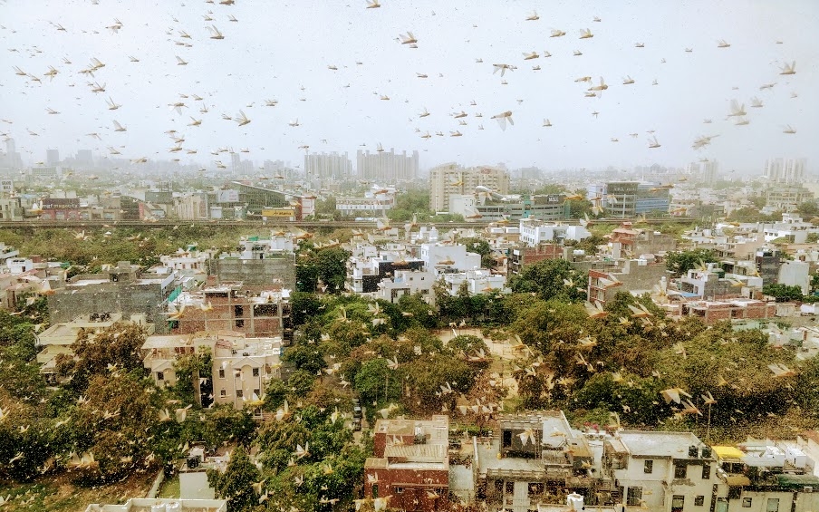 Thousands of crop-destroying desert locusts were seen in the sky in Gurugram today as residents rushed to shut their windows and doors to prevent the insects from entering their houses. Many residents made clanging noises by beating utensils to ward the insects off while other areas bellowed sirens from their buildings.