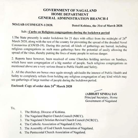 In an order released on 31 March 2020 by Abhijit Sinha IAS, Principal secretary – Home department, Govt of Nagaland, advised all churches to refrain from holding any religious congregation during the lockdown period.