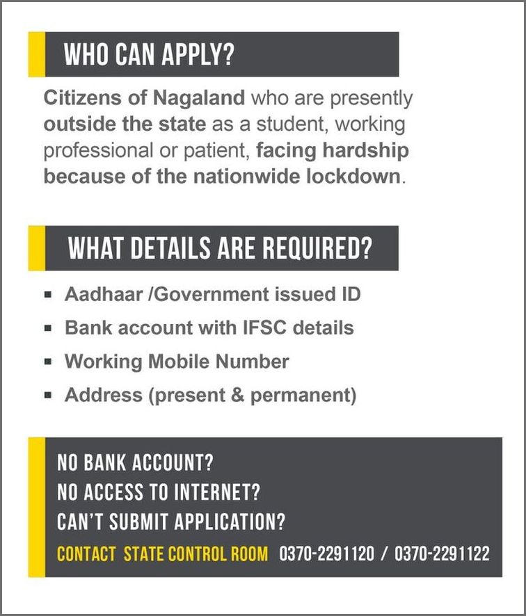 Please refer the infographic on availing #COVID19 Relief Fund for the citizens of #Nagaland who are stranded outside the state because of the #nationwidelockdown. pic.twitter.com/dlvUlJ3lrI