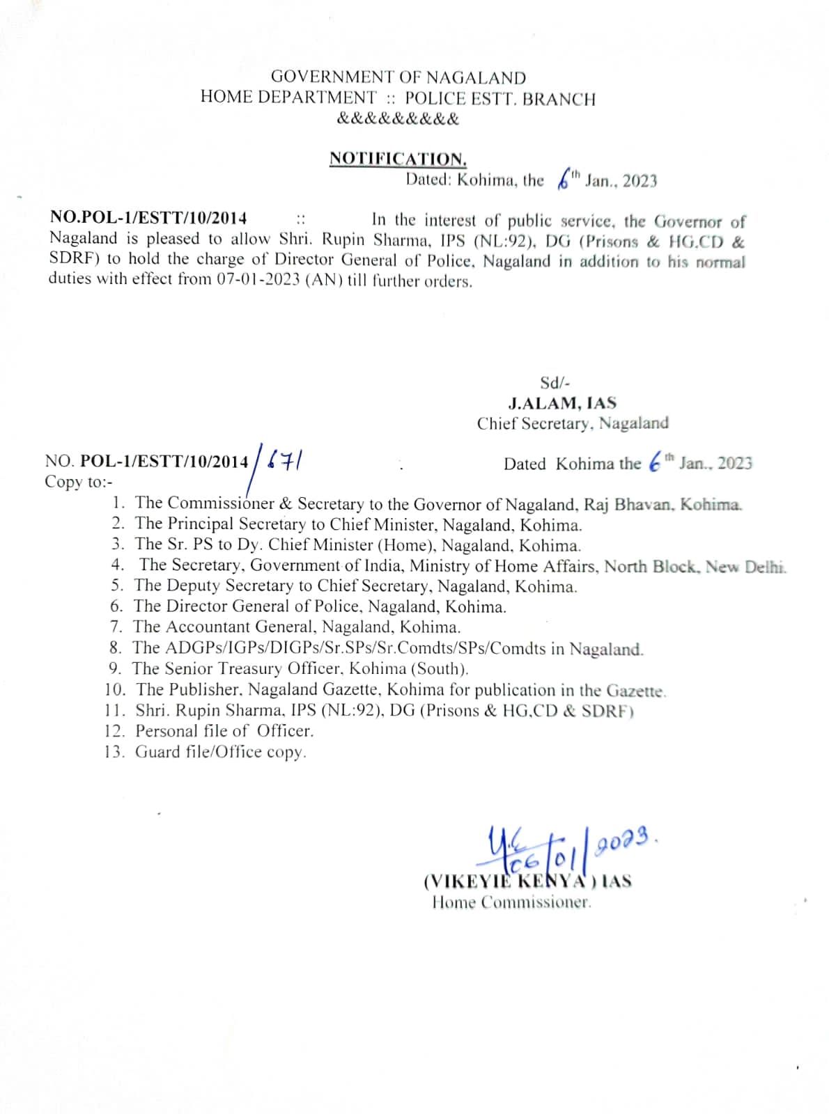 1992 batch Indian Police Service officer Rupin Sharma has been appointed Director General of Police Nagaland.