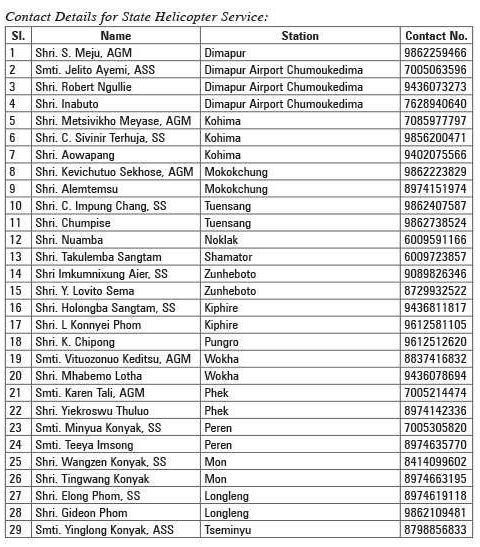 General Manager, Nagaland State Transport (NST) Shikaho P. Yeptho has informed the public to contact the concerned NST officials for State Helicopter Service Ticket booking, Medical evacuation & Charter service as under. For medical evacuation or charter service: Dy. General Manager, Nagaland State Transport, Nungshilemba, at 9774329903; Nokngam Konyak, LDA, at 9862370221. For chartering, requisition must be submitted to General Manager Office, NST Dimapur at least 48 hours ahead of the intended schedule sortie. For medical evacuation, fit to fly certificate of the patient duly certified by a registered medical practitioner is mandatory.