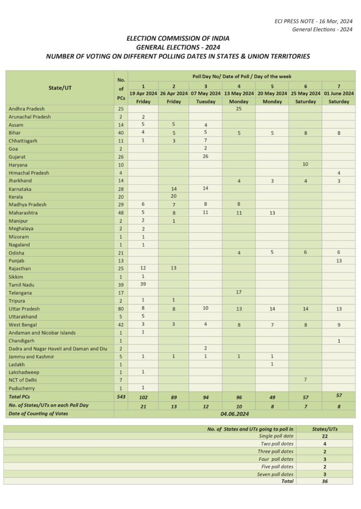 The Chief Election Commissioner Rajiv Kumar announced that the polling for Lok Sabha elections will be held in 7 phases from April 19 to June 1 and counting of votes on 4th June.