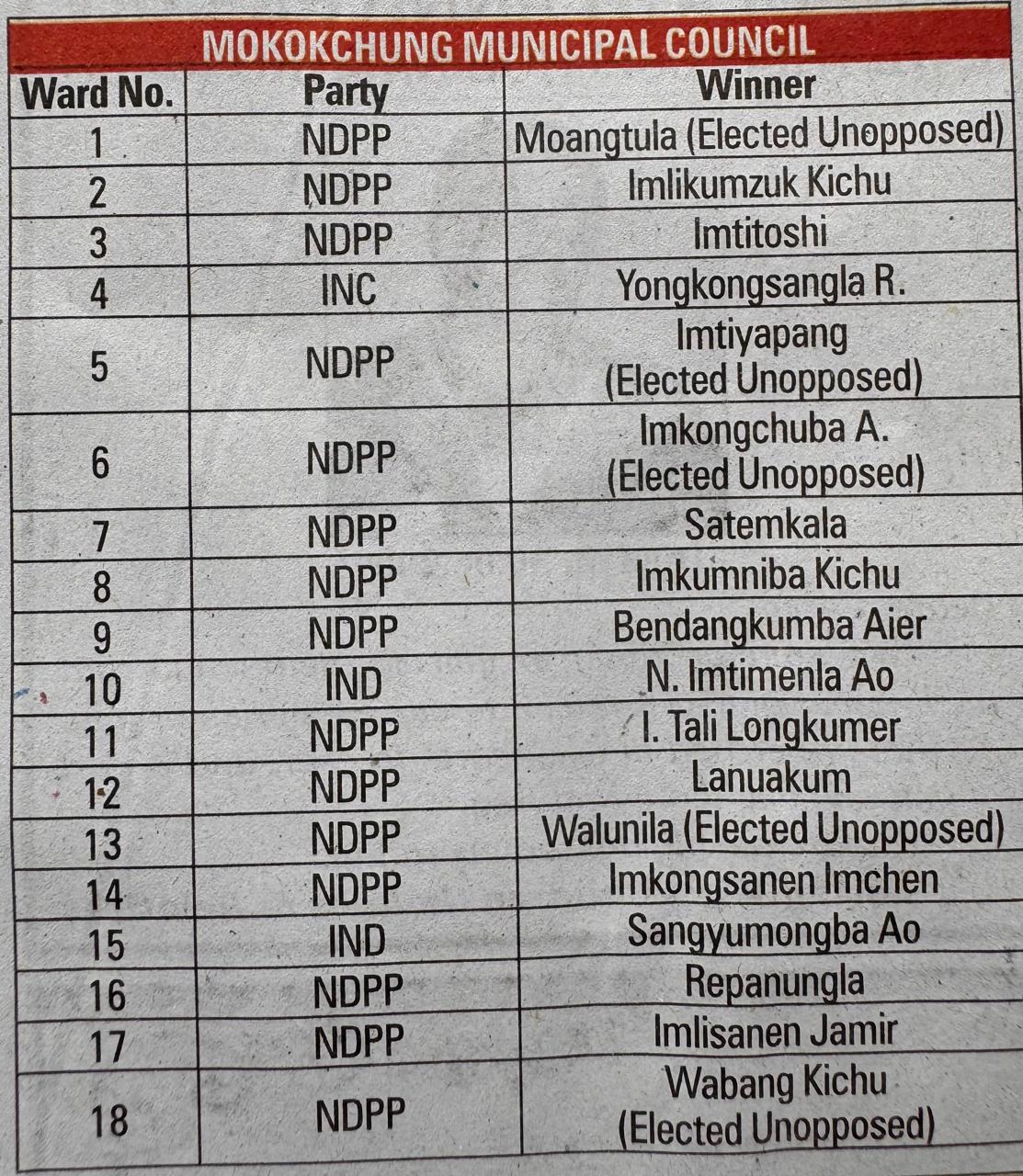 In Mokokchung municipality, NDPP had won 6 uncontested seats out of 18 and increased it to 15. In Dimapur MC, NDPP won 13 out of the 23 seats while BJP got six and two each were won by NPP and Independents. People of Tseminyu Town Council gave a fractured mandate as in the 9 wards NDPP each seat went to NDPP and JDU with 1 going to Independent candidate. Tuli also had a fractured mandate with Congress and BJP winning 3 seats each out of 9 wards, while NDPP got 2 and 1 went to Independent. In the 9 wards of Tening, NDPP got 4, NCP 3 and 2 Independent while in Mangkolemba TC NDPP got 4, Congress 1 and 4 are Independents. In Atoizu TC, where none of the parties got absolute majority in the 9e wards, NCP won 4, BJP 2 and Independent 2 and NDPP 1. Interestingly in Chozuba TC, people favoured the Independent candidates as they voted for 5 of them in the 9 seats while NDPP won 4.