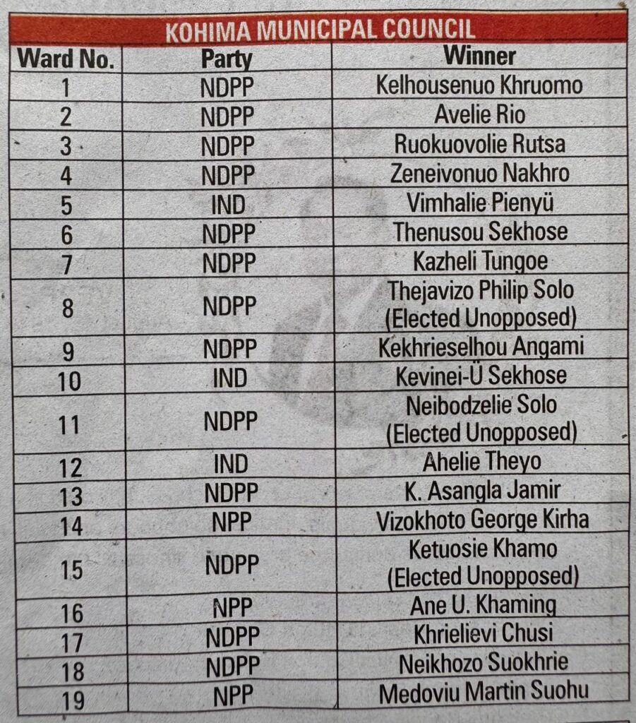 In the capital municipality, NDPP which had already won 5 seats as unopposed out of the 19 wards for Kohima Municipal Council, added 8 more after the final declaration of result to have the majority seats.